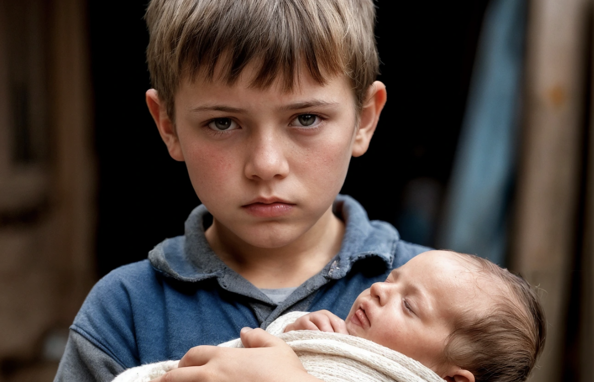 Przed nim stało dziecko około siedmiu lat, wychudzone, zaniedbane, z zapłakanymi oczami. Trzymało w ramionach maleńki zawinięty pakunek, z którego wyłaniała się twarz niemowlęcia. Dziewczynka owinięta była w stary, podniszczony koc, słabo popłakiwała, a chłopiec trzymał ją jak jedyną ochronę w obojętnym świecie.