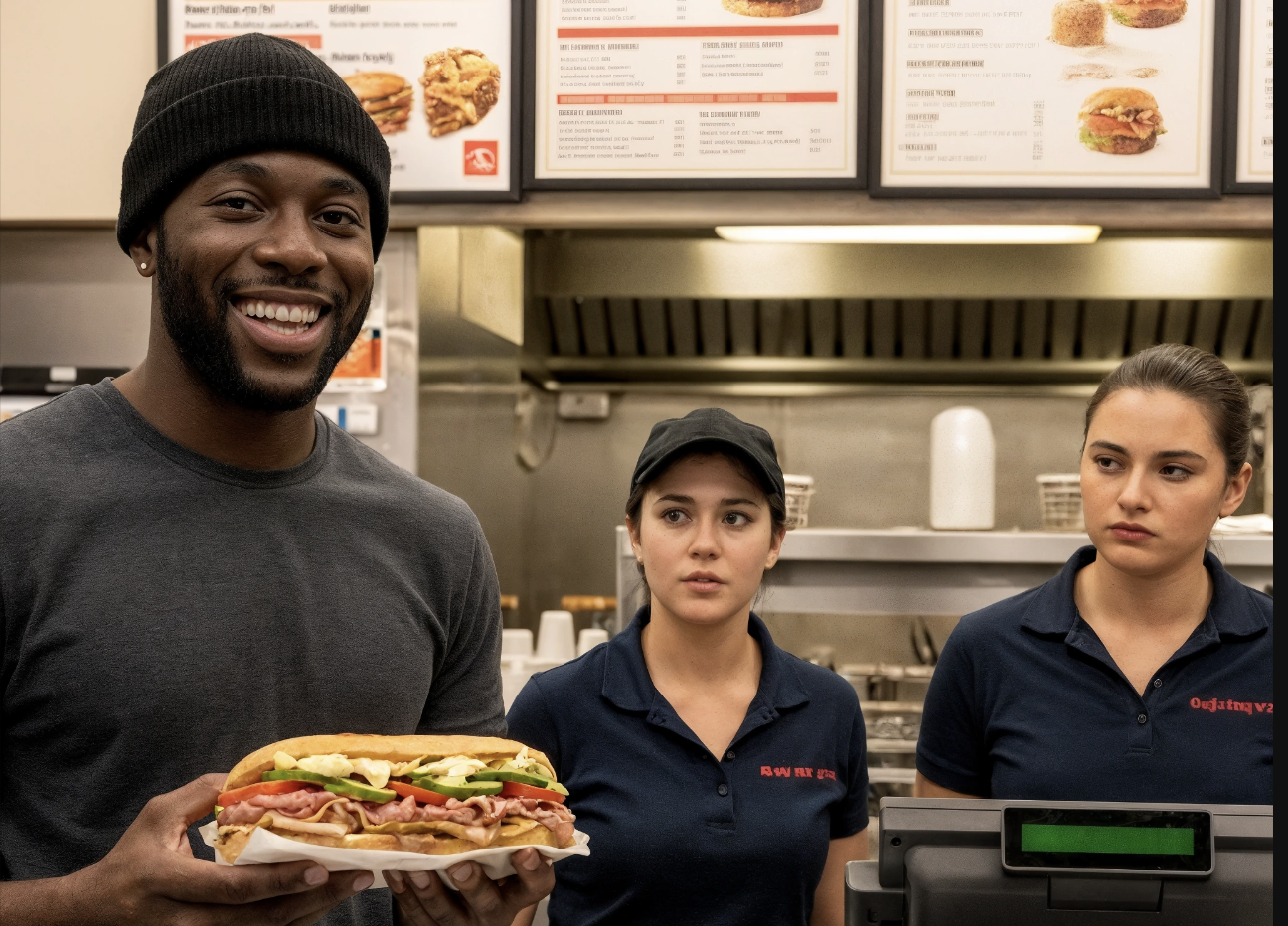 Za ladą stały dwie kasjerki. Pierwsza, szczupła i ubrana w różowy fartuch, głośno przeżuwała gumę i skupiała się na ekranie telefonu. Druga, starsza i pulchna, miała zmęczone spojrzenie i nosiła identyfikator z napisem „Denise”. Żadna z nich nie zwróciła na niego uwagi, gdy wszedł.