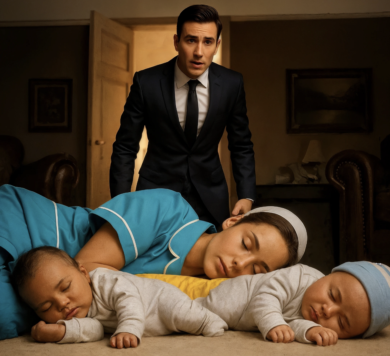 Tuż na podłodze, przy delikatnym świetle lampy, leżała młoda kobieta w turkusowym uniformie. Jej głowa spoczywała na złożonym ręczniku. Długie rzęsy delikatnie muskały policzki, gdy pogrążona była w głębokim śnie. Wokół jej sylwetki tuliły się dwoje sześcio-miesięcznych chłopców — jego cenne bliźnięta — owinięte miękkimi kocykami, maleńkie piąstki zaciskające się na jej ramionach.