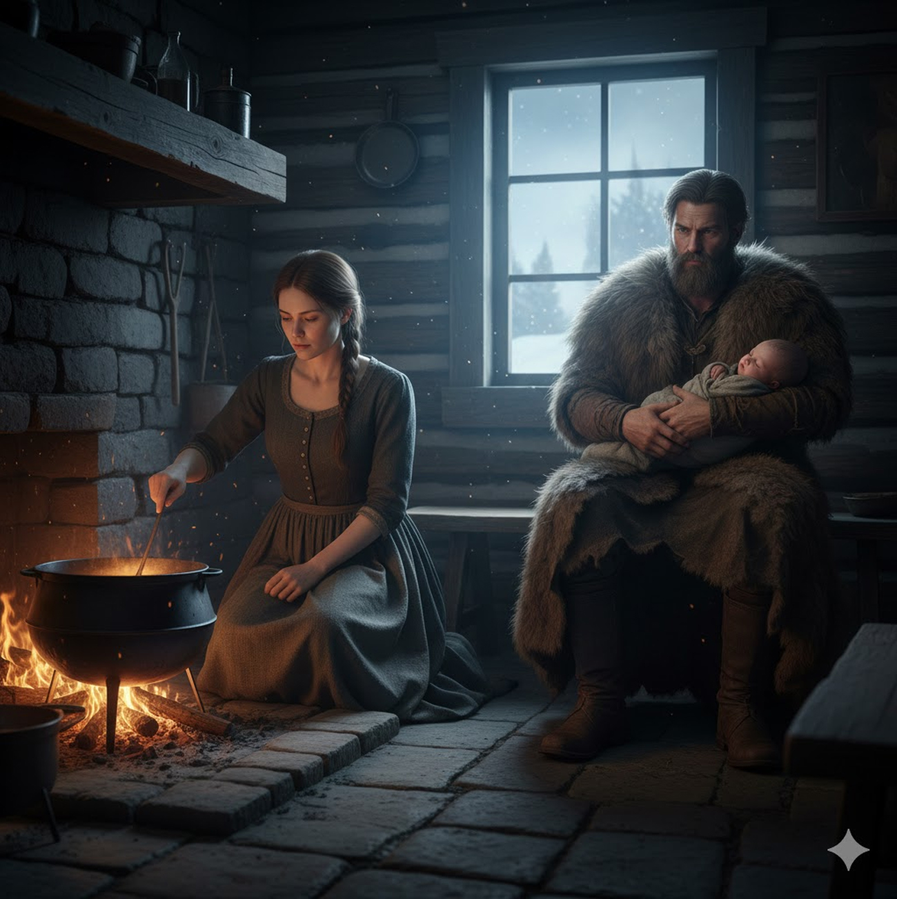 Chata Emmy była mała: jedna izba, łóżko, stół, kilka krzeseł, parę półek i niewiele zapasów, aby przetrwać zimę. Wystarczająco dla jednej osoby, nie dla trzech. Obserwując ich, czuła, jak w jej umyśle zaczyna działać niewidoczny kalkulator: ile worków mąki jeszcze ma, ile wędzonego mięsa, ile dni mogłaby to podzielić, jeśli się podzieli.